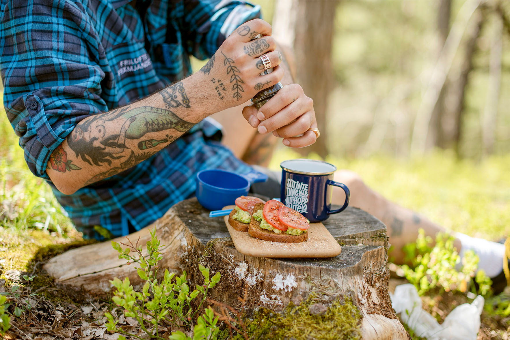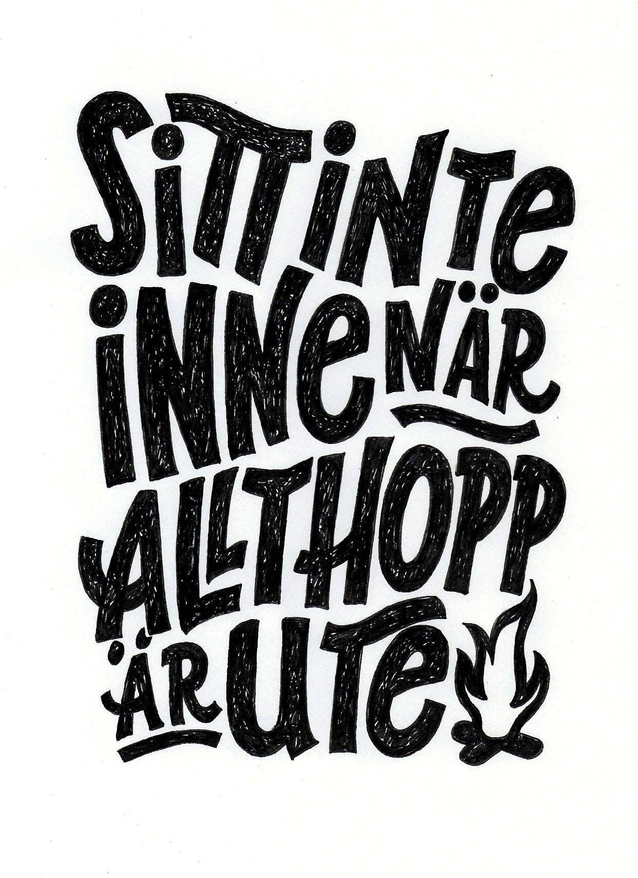 Lösningen Efter en massa skissande med papper och penna presenterade jag digitala utkast. Vi testade ett par olika varianter av frasen Sitt inte inne när allt hopp är ute – och i slutändan landade vi i en lösning med lägerbrasa i kompositionen. Det färdiga alstret finns att köpa på ett antal olika produkter i Friluftsfrämjandets webbshop.