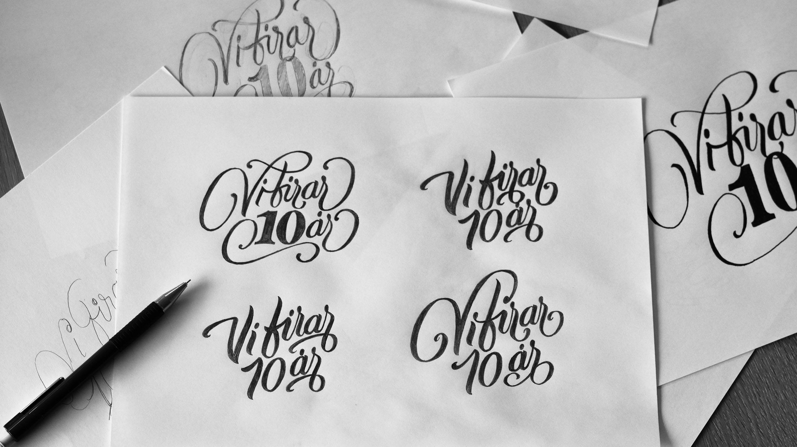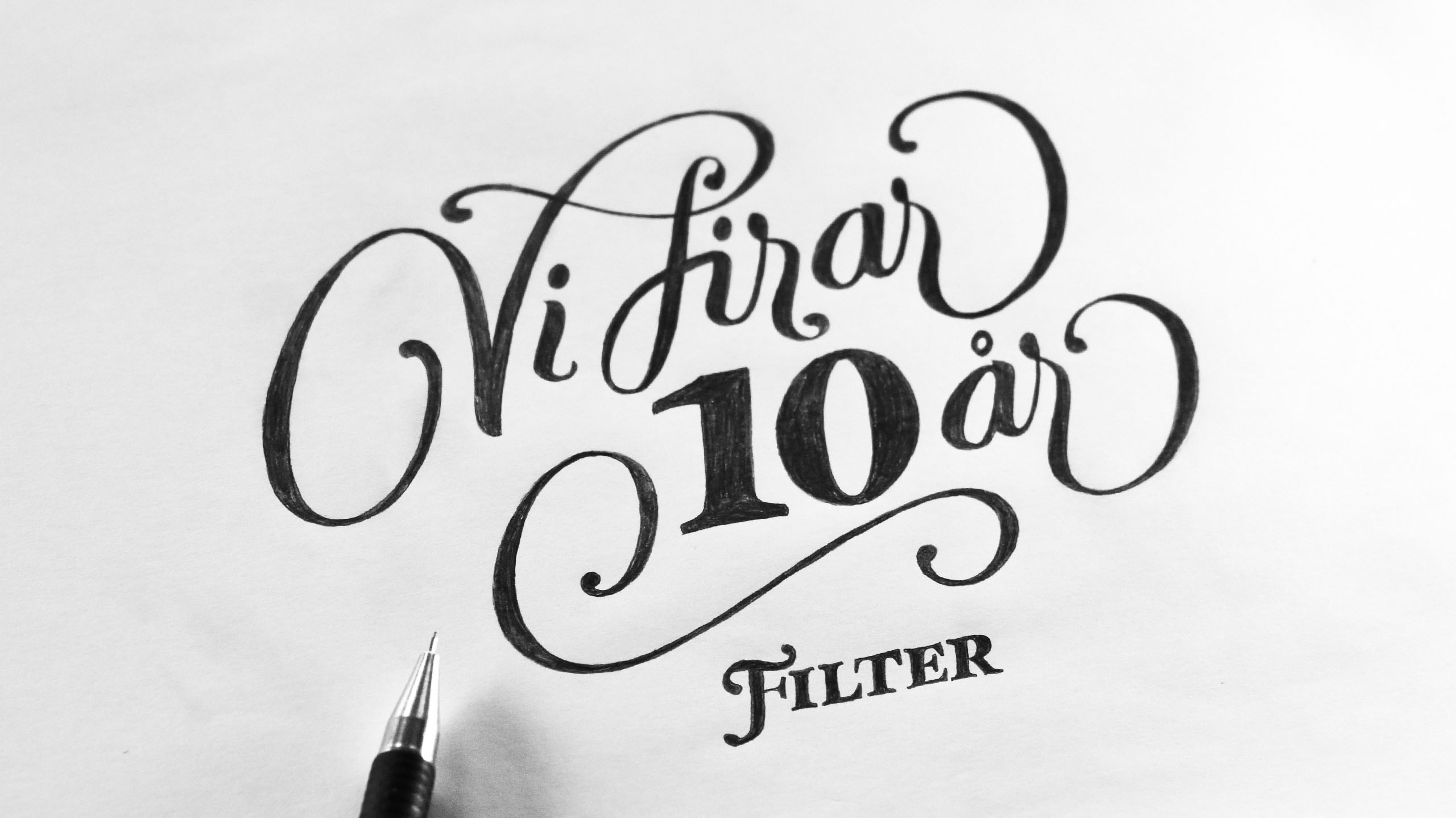 Lösningen Jenni hade redan hittat en ”swooshig” skriptstil på min hemsida som hon trodde skulle passa bra, så mitt initiala fokus var att hitta en bra komposition för bokstavsillustrationen. Efter en massa handskissande, presenterades fyra digitala utkast för Jenni och Magasinet Filter. De valde ett alternativ där siffran 10 var skrivet i samma stil som magasinets logotyp. Efter den initiala feedbacken finjusterades bokstavsillustrationen för att säkerställa att den var läsbar i alla storlekar – bland annat redigerades f:et för bättre läsbarhet. En utmaning med bokstavsillustrationen var att hitta en lösning som kunde stå på egna ben, men också fungera ihop med Magasinets Filters existerande logotyp – och det lyckades vi med. Årstalsvinjetterna gjordes ut i samma stil som emblemet.