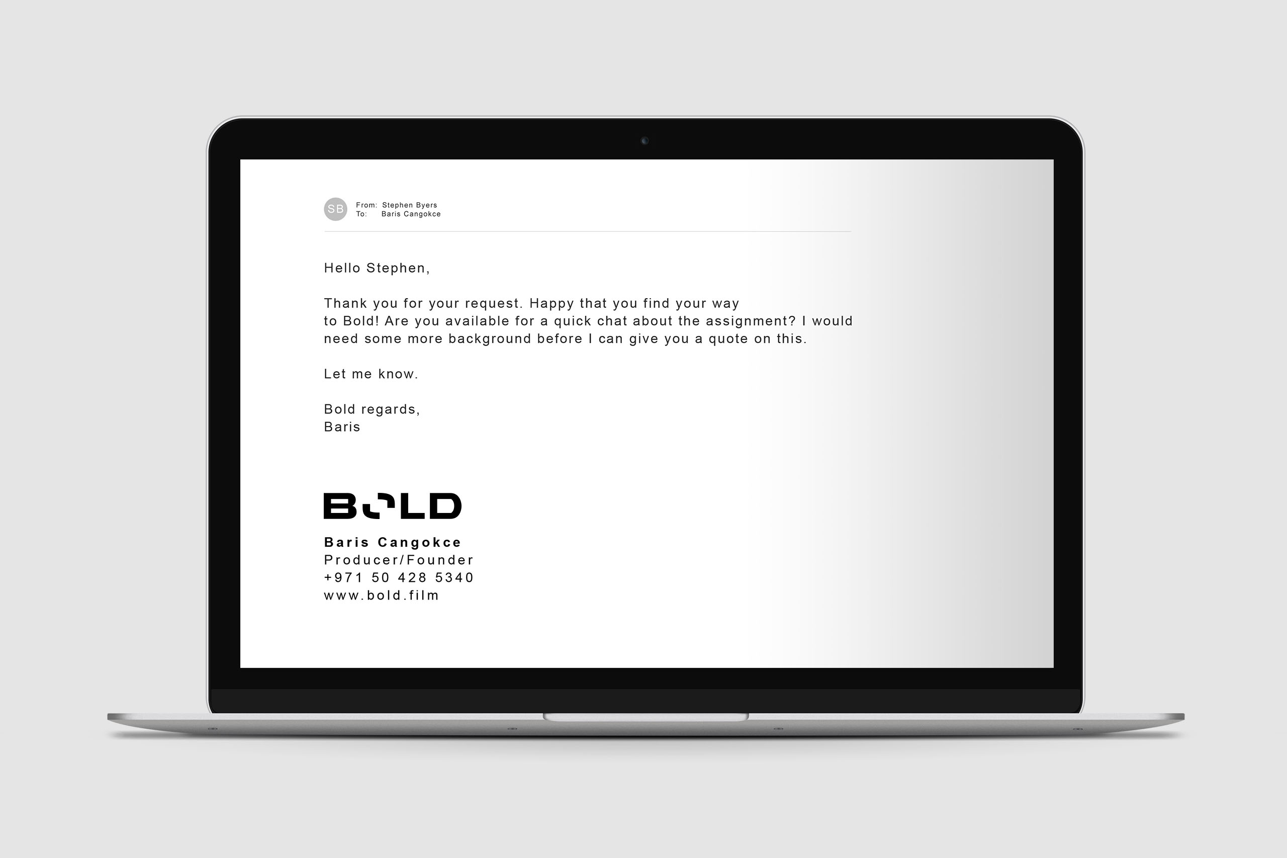 Uppdraget Skapa en logotyp åt Bold, ett filmproduktionsbolag baserat i Dubai. Företaget är specialister på trixig action, bilreklam, explosioner och flygkoordineringsfilmning. Kunder är produktionsbyråer från hela världen som har projekt med komplex filmning som kräver fullt fokus. Viktiga värdeord är: orädd, betrodd och erfaren. Logotypen kommer primärt att användas till digitala presentationer, sociala medier och hemsida.