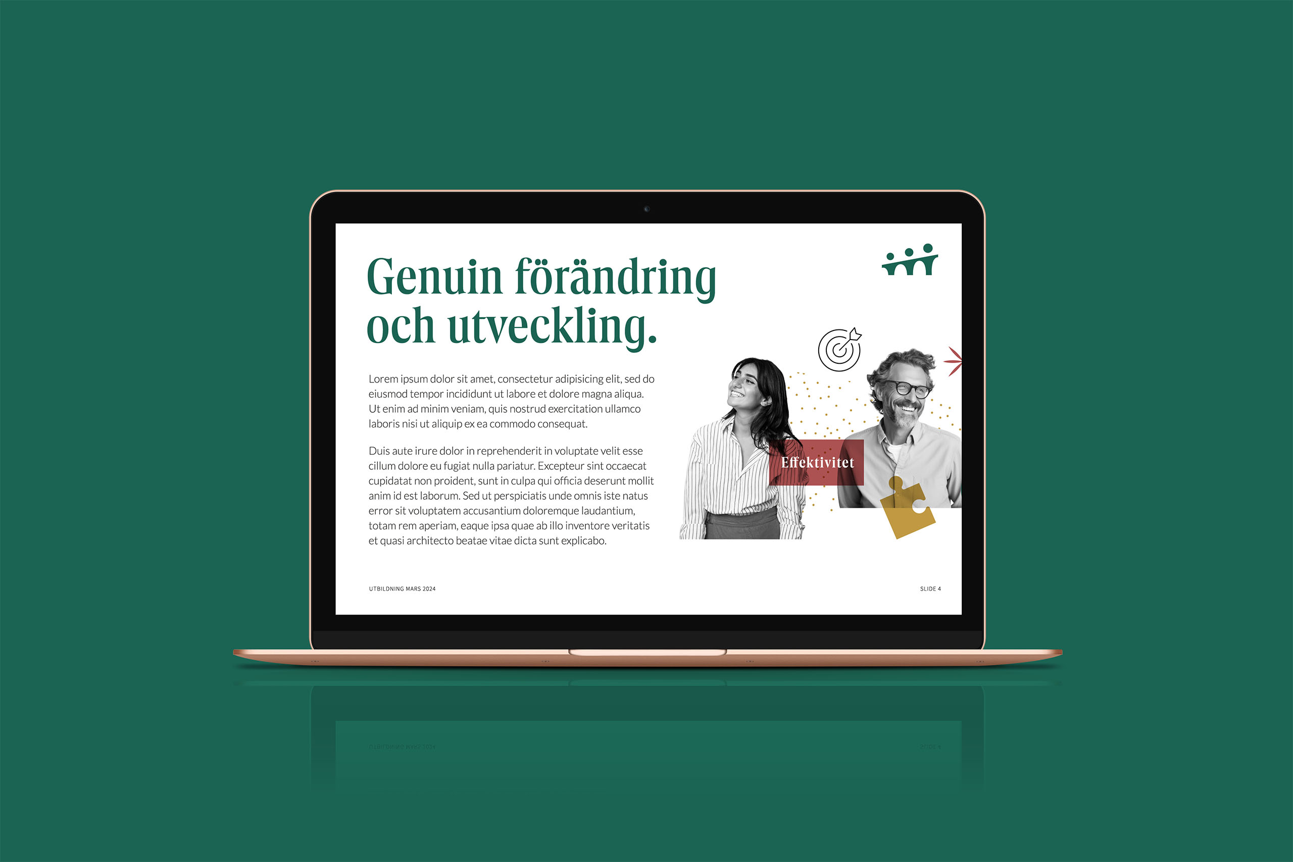 Lösningen Efter initialt möte och genomgång av material så fastnade jag för frasen: “genom att skapa en fungerande dialog mellan ledning och team ökas medarbetarnas prestation, arbetsglädjen ökar och effektiviteten med den”. Den säger det mesta om kärnan i företaget. Frida lär känna människorna, finner deras potential och lockar fram det bästa i dem för att få ökad arbetsglädje och bättre sammansvetsning mellan team och ledare – vilket i sin tur resulterar i ökad effektivitet och prestation. Företaget erbjuder många tjänster, men det som förenar dem är att det handlar om människor och utveckling – vilket resulterade i en logotyp som visualiserar just detta. En bro av människor som växer och utvecklas tillsammans. Logotypen kompletteras av en varm och pigg färgpalett, ett linjärtypsnitt och ett grafiskt manér som sammantaget gör att företaget sticker ut i havet av konsultbolag.